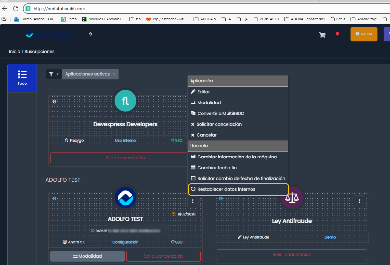 Este mensaje suele aparecer cuando movemos una base de datos donde compartimos el mismo nombre de servidor y mismo nombre de instancia y la base de datos tiene el mismo nombre. Para solucionar este mensaje que ofrece el ERP tan solo hay que ir al portal ABH (Ahora Bussiness Hub) y en la licencia importada seleccionar a través de la pulsación del menú de los 3 puntos y elegir la opción remarcada en amarillo "Restablecer datos internos".