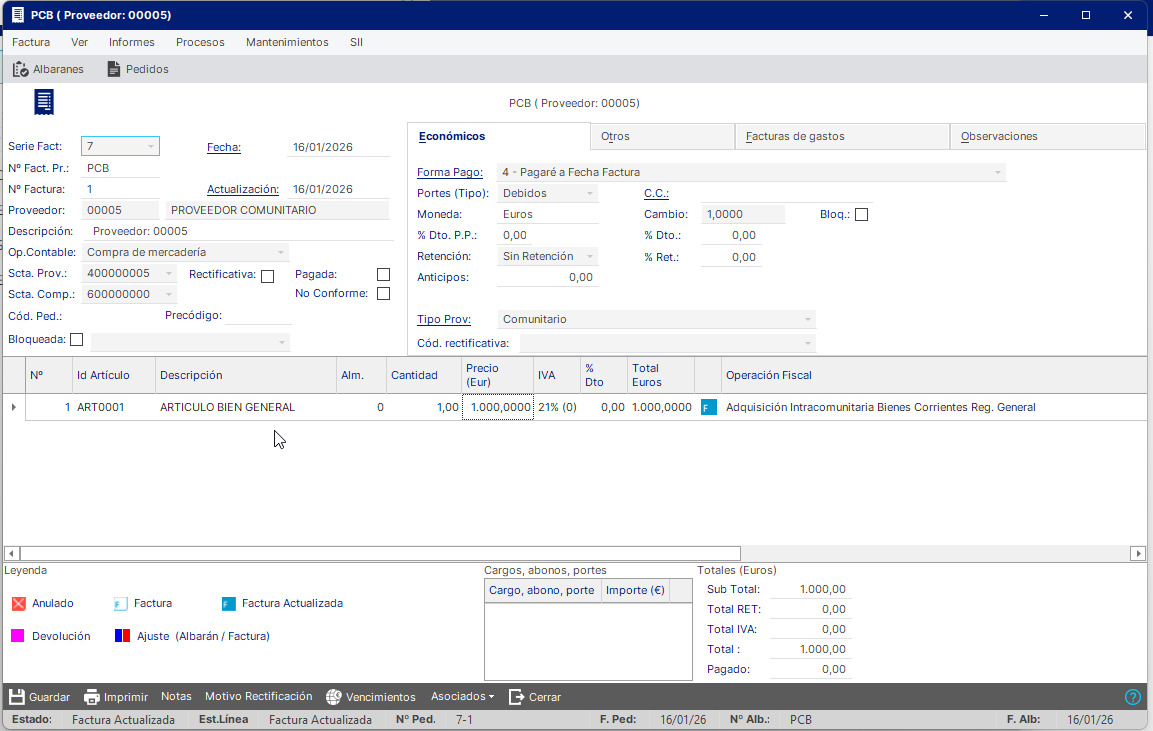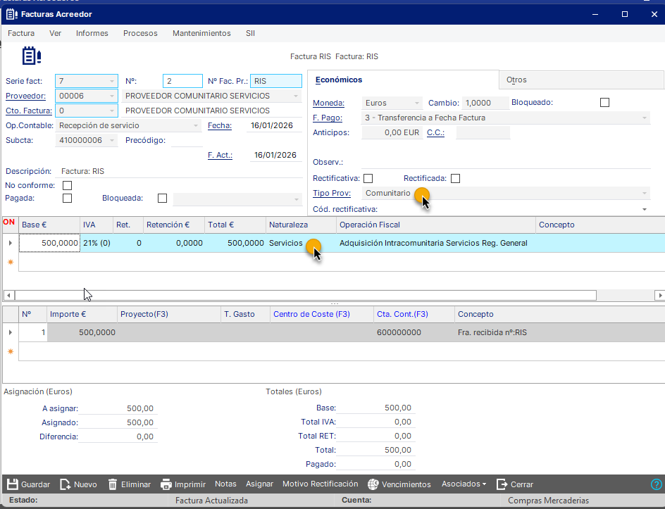 Para gestionar correctamente la adquisición intracomunitaria de bienes/servicios en AHORA ERP, como punto clave, hay que configurar correctamente el proveedor comunitario:
