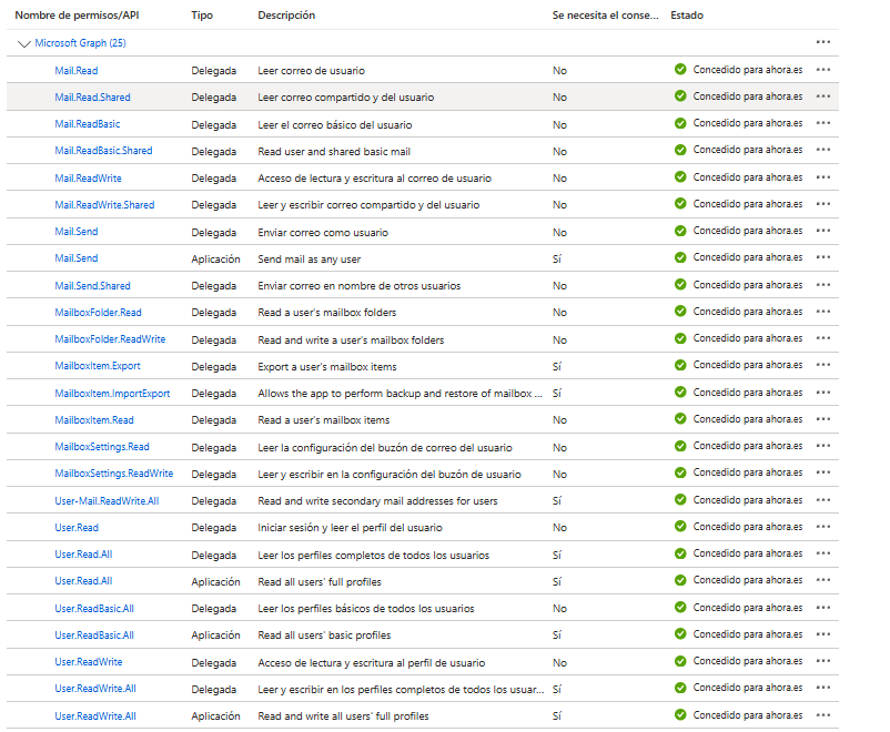 - Estos son todos los permisos necesarios, una vez añadidos, le damos a conceder consentimiento de administrador para Directorio predeterminado.