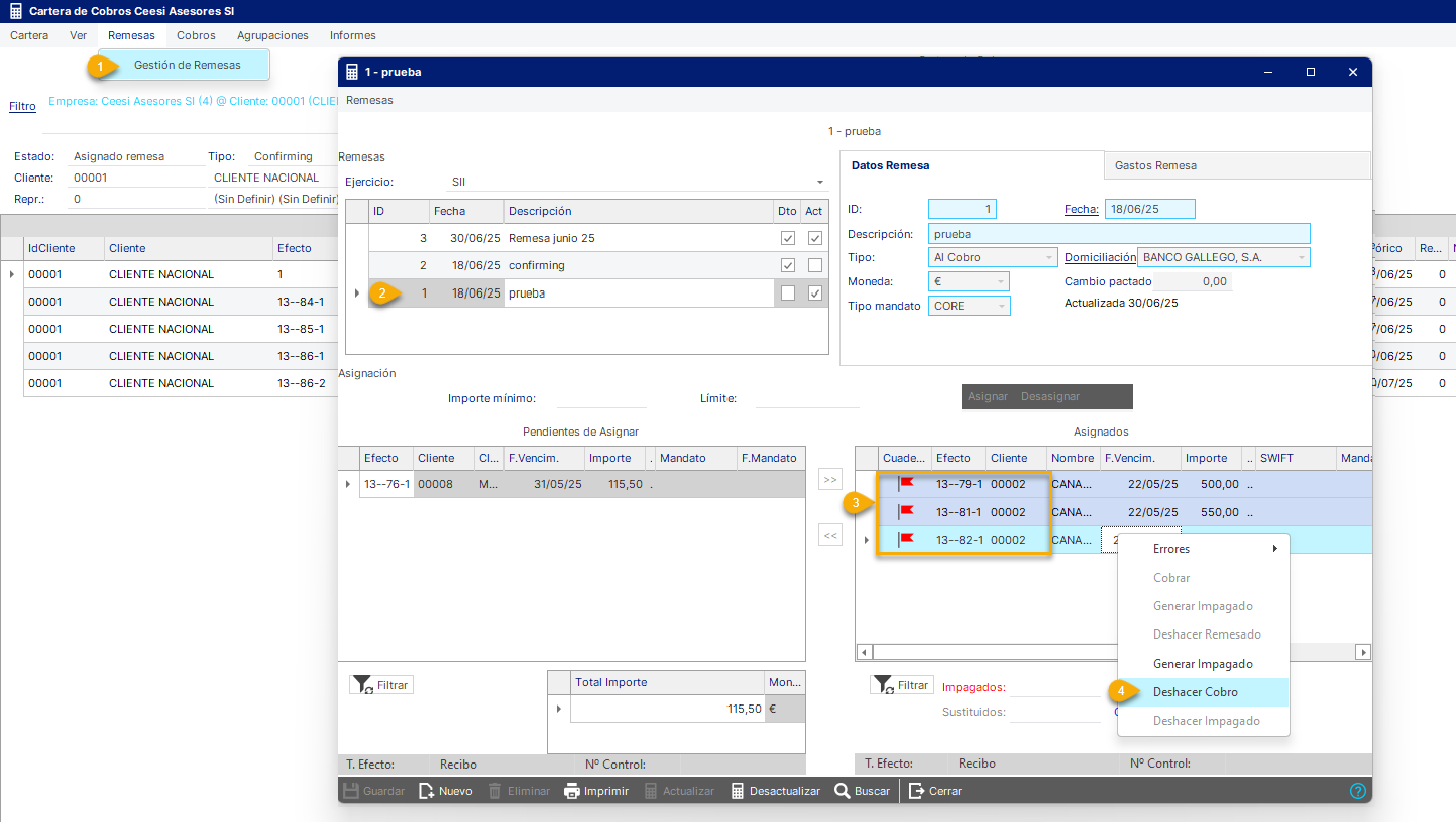 Los efectos cobrados desde gestión de remesas se pueden cobrar, de forma individual o de forma masiva.