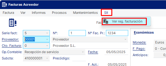 Se añade un nuevo menú contextual en las facturas que permite acceder directamente al registro correspondiente del SII (Suministro Inmediato de Información):