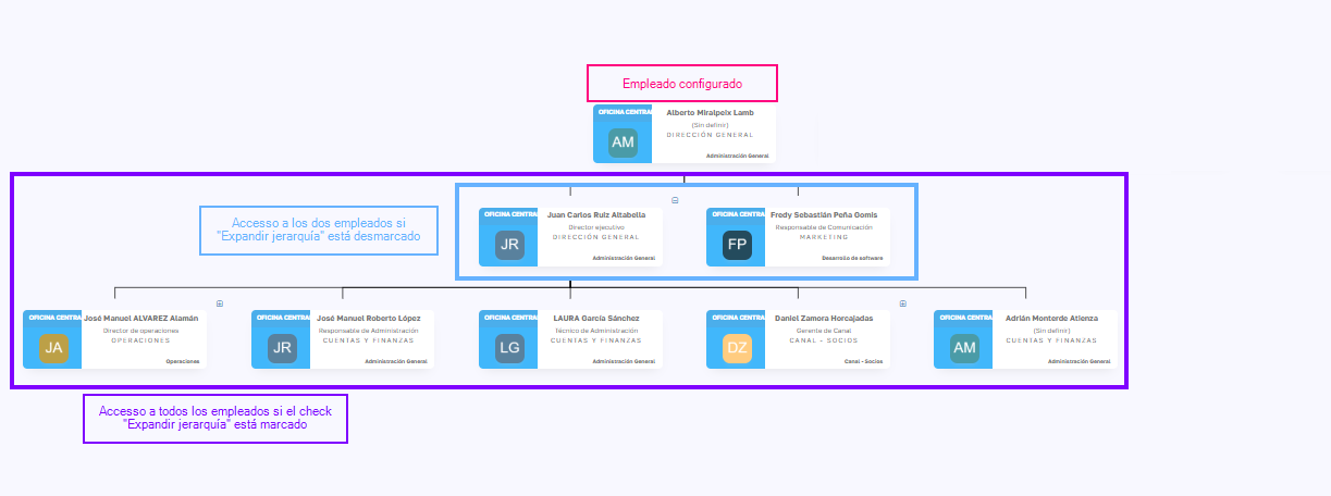Una vez configuradas las reglas de acceso, el sistema determina a qué empleados puede acceder cada usuario de la aplicación. Este acceso se basa en dos elementos: