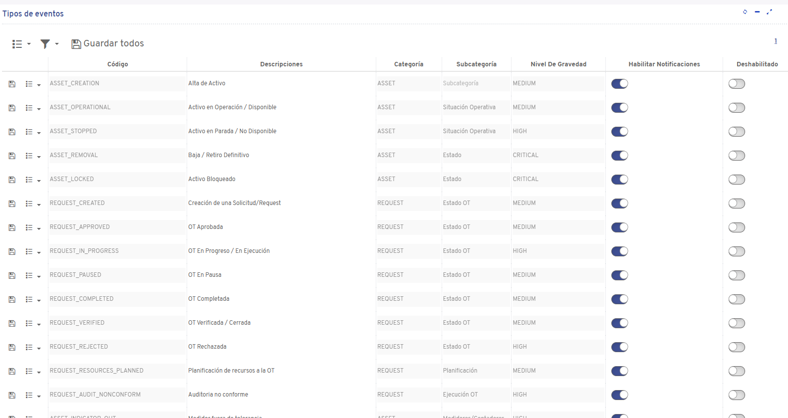 Podemos acceder a los tipos de Eventos desde la pagina de configuración. Desde la lista de tipos de evento podemos Habilitar/Deshabilitar la generación de cada tipo de evento o silenciar sus notificaciones.