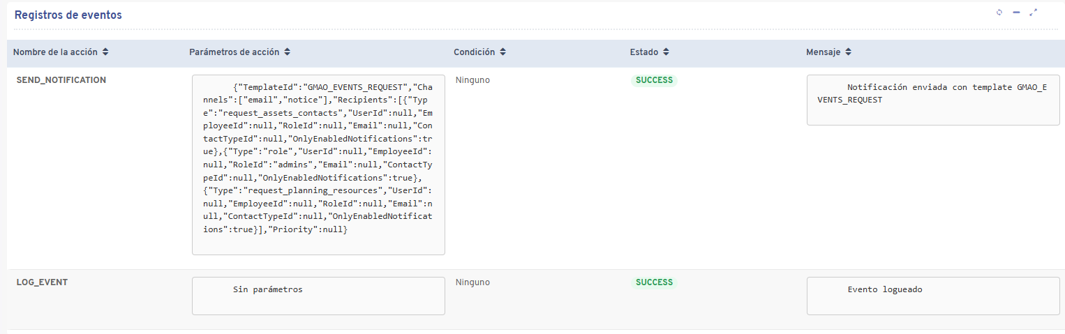 SEND_NOTIFICATIONrequiere al menos un canal y un destinatario.CREATE_REQUESTpermite definir parámetros arbitrarios que luego se pasan al proceso de creación.- Todos los eventos procesados generan un registro en