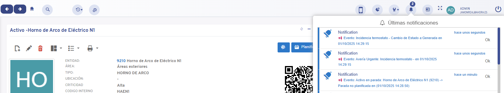 Si el procesamiento de nuestros eventos tienen notificaciones nos aparecerán en la campanita de la pantalla principal (en caso del canal "notice" o directamente en el mail del recipient correspondiente:
