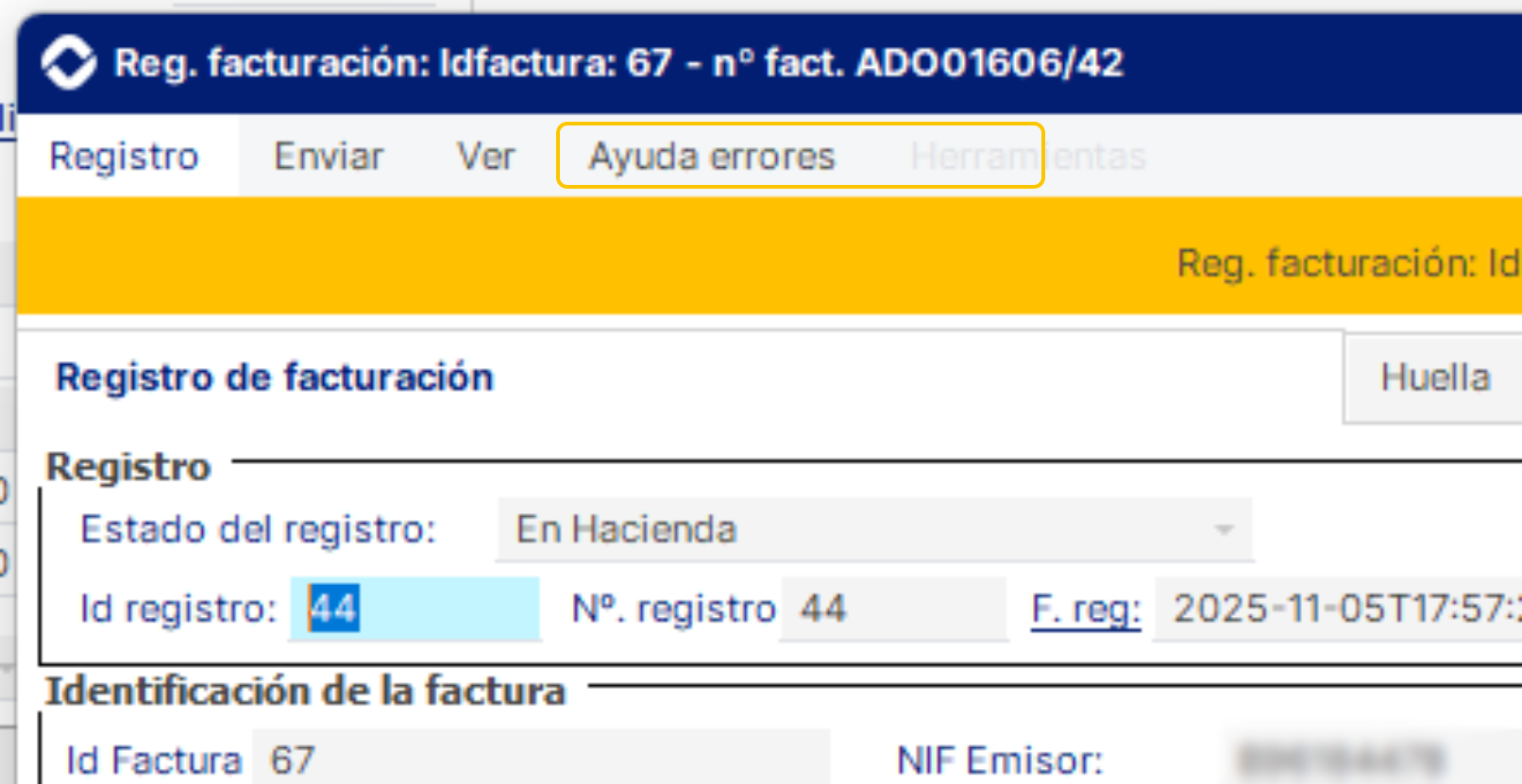 Si el cliente no se ha configurado correctamente, a través de la utilidad de 'Ayuda errores' se podrá consultar el código del error que devuelve AEAT para verificar los pasos a seguir para corregir la situación, tal como se muestra en el ejemplo.