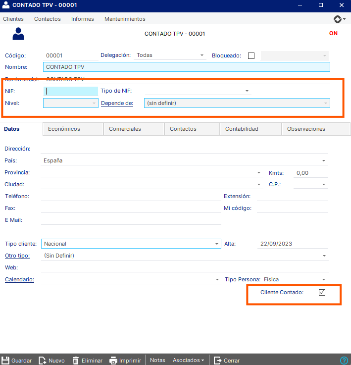 NOTA: Si la factura se contabiliza desde el ERP, es posible que el sistema obligue a introcucir un NIF en la fecha del cliente antes de contabilizar la factura. En ese caso introducir un NIF ficticio (como por ejemplo el CIF de la empresa principal). El mismo no será tenido en cuenta en las comunicaciones con la AEAT.