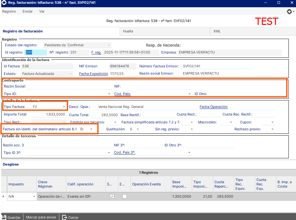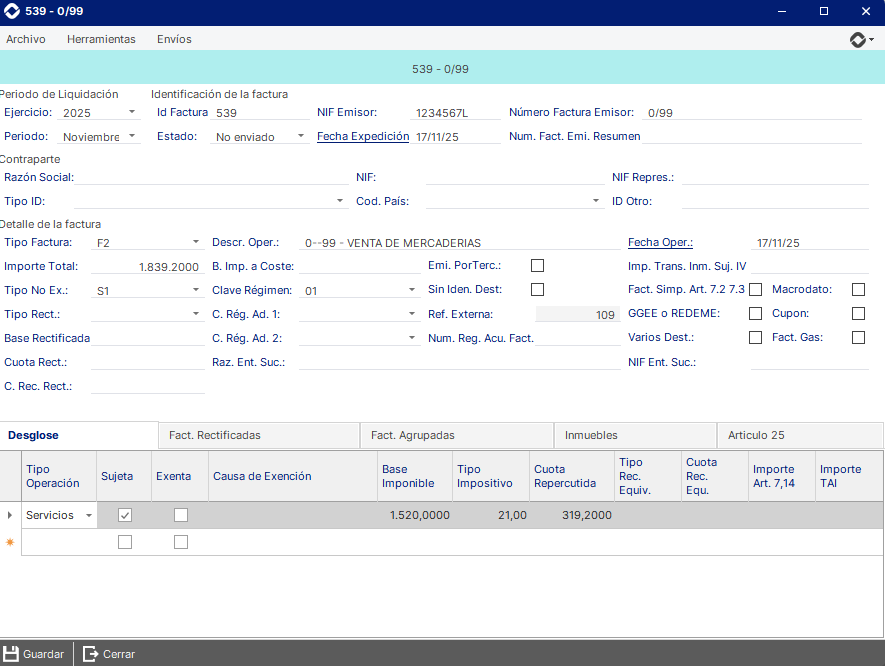 Una vez se genera el registro de la factura veremos como este aparece sin el NIF ni razón social, además con un tipo de factura 'F2', ya que en este caso al ser una factura de un cliente contado no se informan de estos campos.