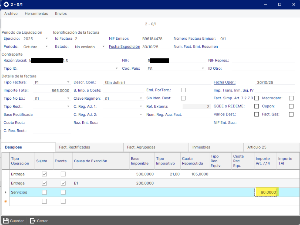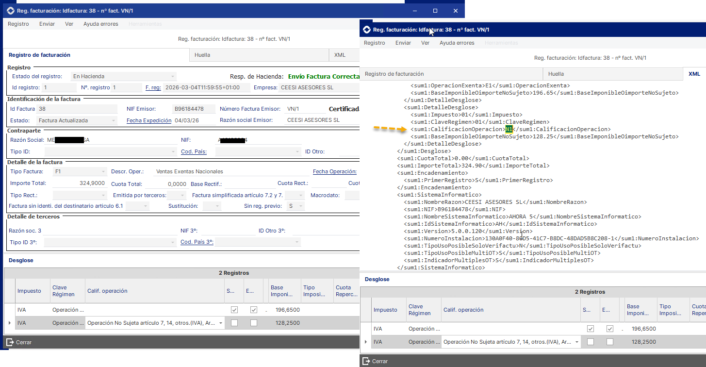 "VT" NO se corresponde con N1 - Para más información del tratamiento de suplidos en VeriFactu - Enlace.