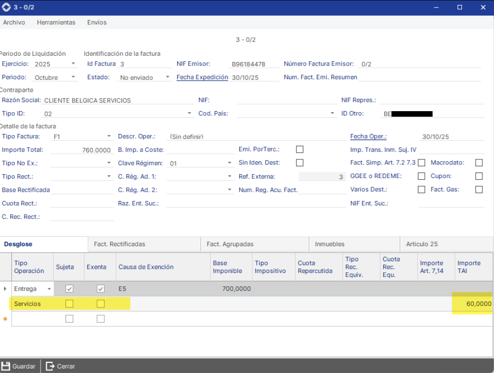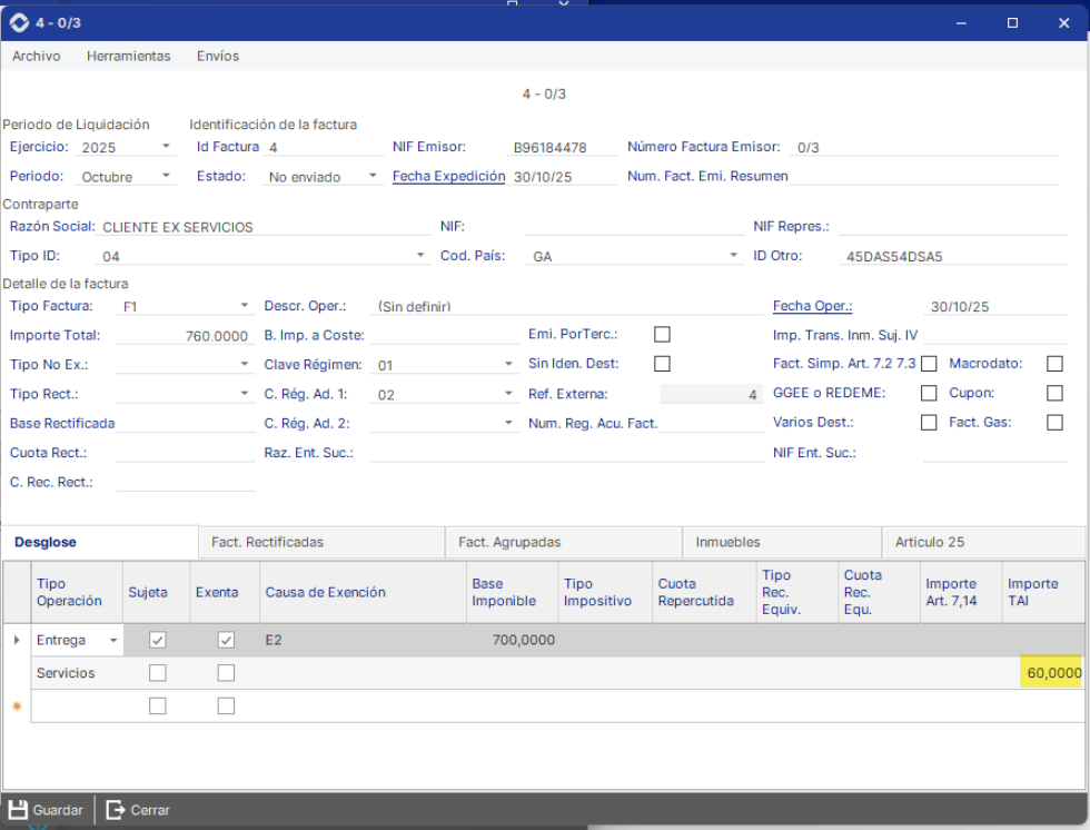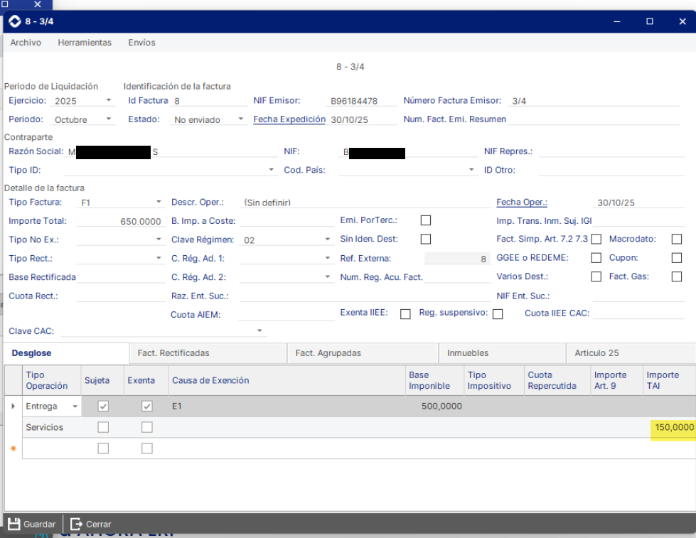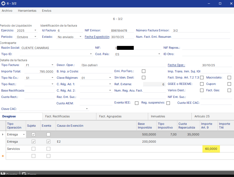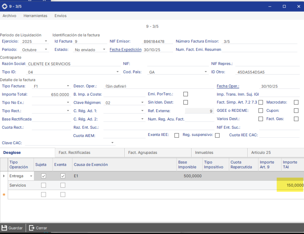 En AHORA ERP: No sujeto en el TAI por reglas de localización, pero repercute impuesto extranjero (IVA UE, IGIC, IPSI).